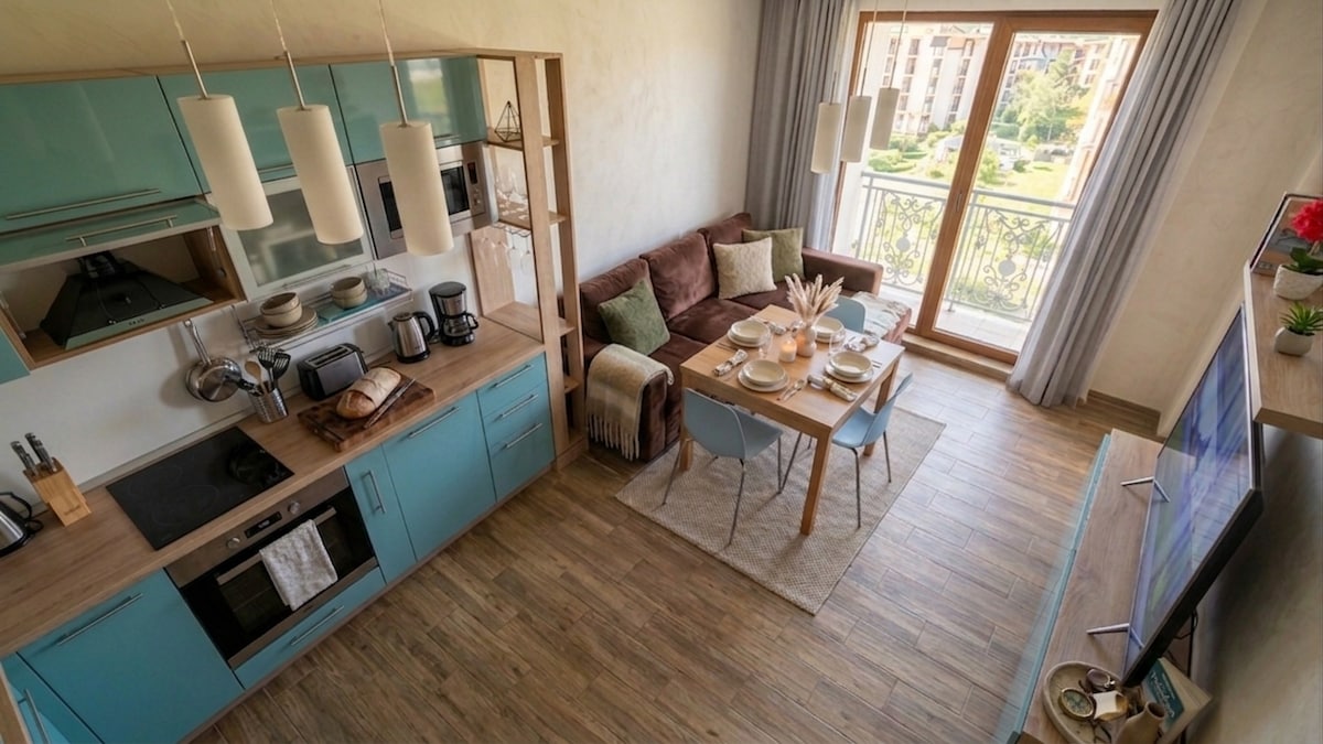 Welcome to our stylish and cozy apartment, located in an elegant family-friendly aparthotel in the heart of Sunny Beach. The space combines comfort and tranquility with access to a large outdoor swimming pool for adults and children. Just 800 m from the beach and a 7-minute walk to the vibrant resort center with fine restaurants, shops, and развлечения. A perfect choice for a refined and carefree summer stay.