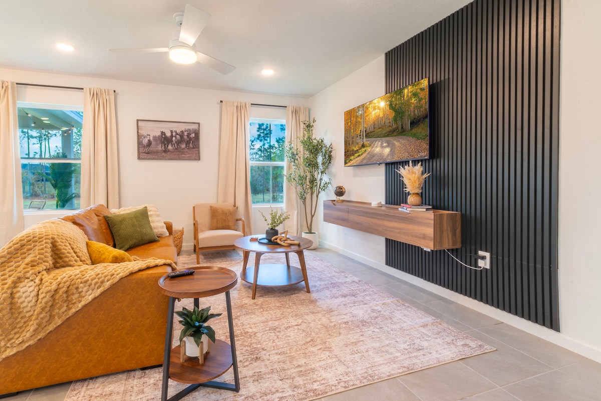 Welcome to your stylish Ocala retreat. This modern black and gold inspired space is designed for comfort and relaxation. Enjoy a cozy electric fireplace, large Smart TV, elegant dining area, spa style bathroom, and a fully stocked coffee bar to start your mornings right. Whether you are visiting for work or leisure, this calm and thoughtfully designed home offers everything you need for a comfortable stay.