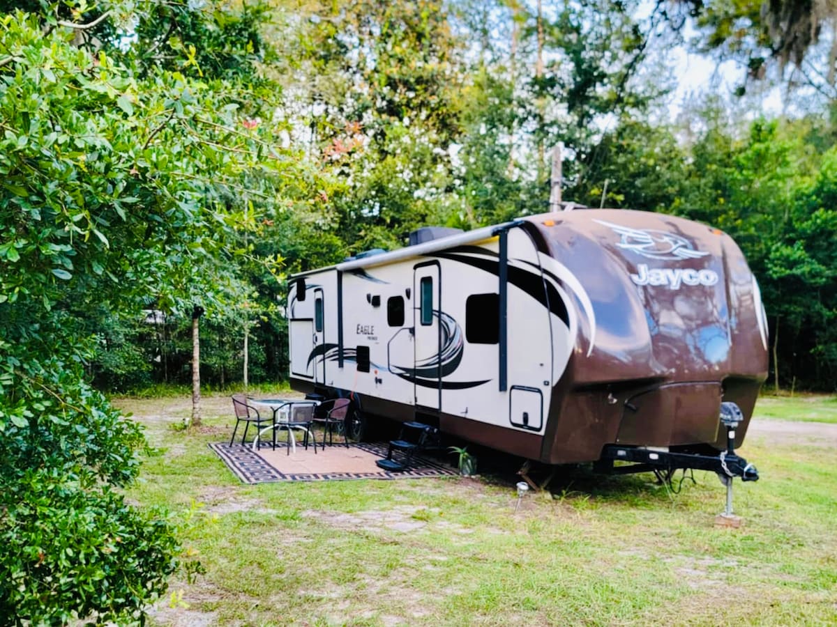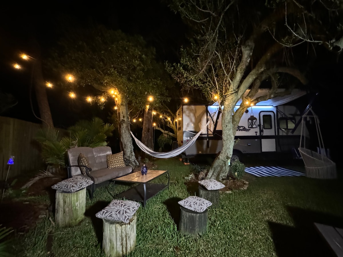 Get away from it all when you stay under the stars and Glamp the night away with family/friends. A one of a kind RVGlamp stay on shared Private Fenced property a short drive from Silver Spring State Park. A peaceful relaxing stay nestled away from the bustle but still very close to everything.If you love the outdoors and waking up to birds chirping this is the place for you. Watch an outdoor movie or roast some s’mores by the fire pit.Think camping but with all the comfortable indoor amenities