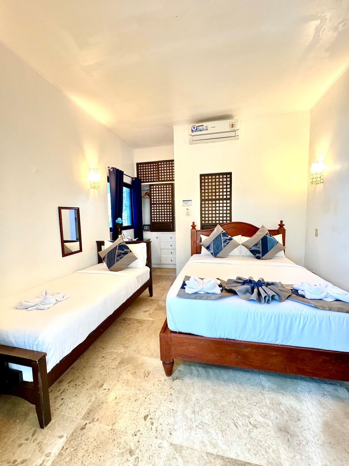 Simple and clean air-conditioned room perfect for couples or small groups. Features 1 queen and 1 single bed, private bathroom, and free access to our beachfront resort. Great for divers and budget travelers looking for a peaceful stay in Anilao. This space includes access to scuba diving activities (PADI/SSI certification, Intro dives, Fun dives), In-Room massage, and Fullboard meals featuring Korean-Filipino comfort food with homemade Kimchi.
