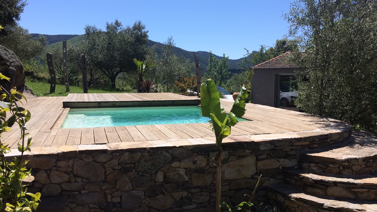 Au pied du Caroux, en pleine nature, grand Studio indépendant, très lumineux, avec accès à la petite piscine. Parfait pour les amoureux du massif du Caroux et des gorges d'Héric, ce studio est le point de départ idéal pour de magnifiques randonnées à travers le Caroux, ses gorges et ses cascades, ses voies d'escalade réputées. Studio de 40m2 avec son coin cuisine et sa salle d’eau, ses 2 grandes baies vitrées lui donne une luminosité exceptionnelle. Une belle invitation à la nature...