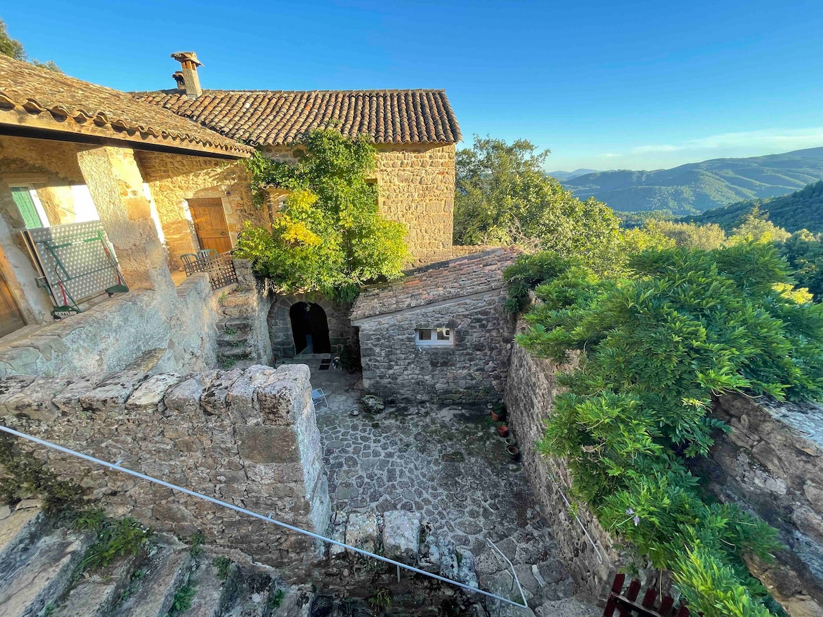 Charmante chambre privée indépendante avec cheminée, salle de bain privée attenante (baignoire) et sa très grande terrasse disposant d’une incroyable vue panoramique sur la vallée et les montagnes. Véritable havre de paix avec pour seul bruit le son du vent et le chant des oiseaux, dans cet ancien mas cévenole immense avec son jardin de plus de 50 000 m2 attenant à la forêt environnante. Lit double, cheminée, SDB, WC, vue, cuisine extérieure indépendante et bien plus.