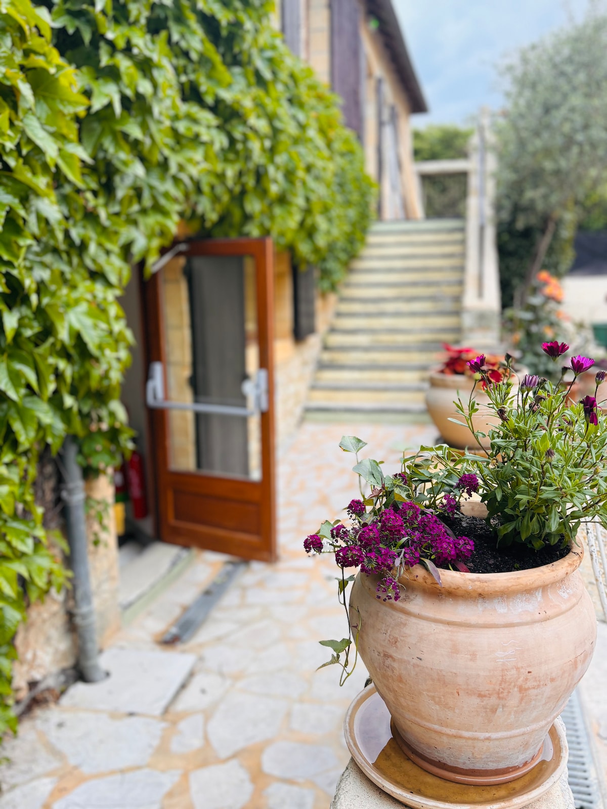 Gîte de standing dans un ancien séchoir à tabac rénové. C'est un mélange de tradition et de modernité. Il se situe dans une noyeraie de 5 Ha à La Roque Gageac à 5 minutes de Domme, Beynac, Castelnaud, Sarlat et 30 minutes de Lascaux. A 1.5 km de tous commerces. Endroit calme et verdoyant. Vous pourrez déguster nos produits du terroir dans notre ferme auberge qui se situe à 60 mètres du gîte. Vous avez accès à une piscine chauffée partagée de 11.5m par 5.5m et un terrain de pétanque.