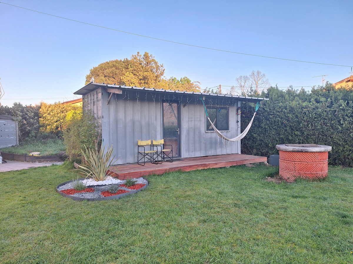 Chambre dans un conteneur rénové de 15 m2. Située à seulement quelques centaines de pas du centre-ville. Indépendant et sans vis-à-vis de la maison principale, vous serez au calme pour passer un court séjour. Vitres fumées (effet miroir) pour davantage d'intimité. Les draps et les serviettes de toilette sont fournis. Wifi Haut débit à l'intérieur via prise CPL. Climatisation/ chauffage. Pendant votre séjour nous serons présents dans la maison et pourrons vous apporter notre aide.