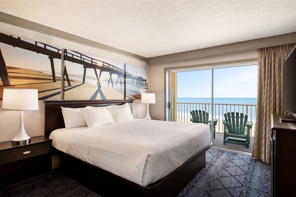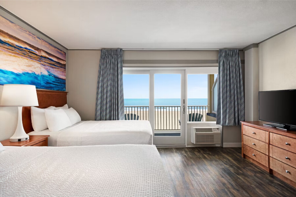 Immerse yourself in the boardwalk experience with this classic oceanfront room. Featuring two double beds and a private balcony directly facing the waves, you can enjoy the ocean breeze 24/7. Modern amenities include a flat-screen TV, refrigerator, and microwave, offering a seamless blend of seaside charm and practical utility for your Maryland coastal adventure.