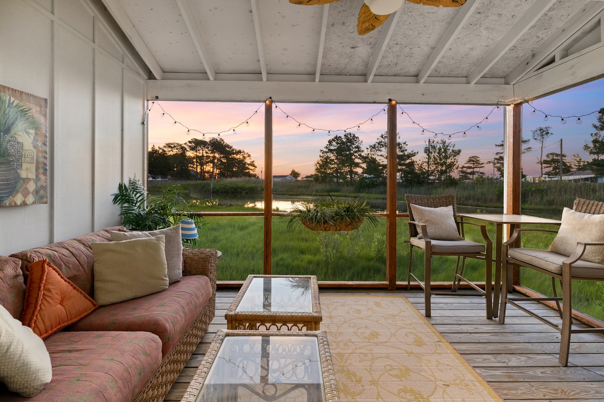 Waterfront Beach Home with large deck with amazing view of the Assawoman Bay and walking distance to the Ocean/Beach, Fagers Island Restaurant & Bar. Linens and towels included. Watch sunsets on community gazebo and dock. Boards games, cards, sunbathing on outdoor couch, Large Yeti Cooler on deck. Chef kitchen. 2 kayaks and 2 SUPs 8 Public lighted Tennis courts (free when pro shop is closed) High Def, Smart TVs High speed internet