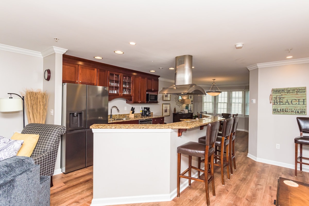 Steps to the sand, sleeps 14 This spacious 5BR & 5 Bath 2 level condo , 2 balconies with partial ocean views, and walk-to-everything convenience. Avoid the crowds, great mid-town location. - 30-second walk to beach - Building elevator w/ handicap access - Fully equipped kitchen & a 2nd kitchenette - 2 covered assigned parking spots & free street parking - Quick access to the best golf courses in the area - Enjoy restaurants, mini-golf & nightlife just blocks away, all with in walking distance!