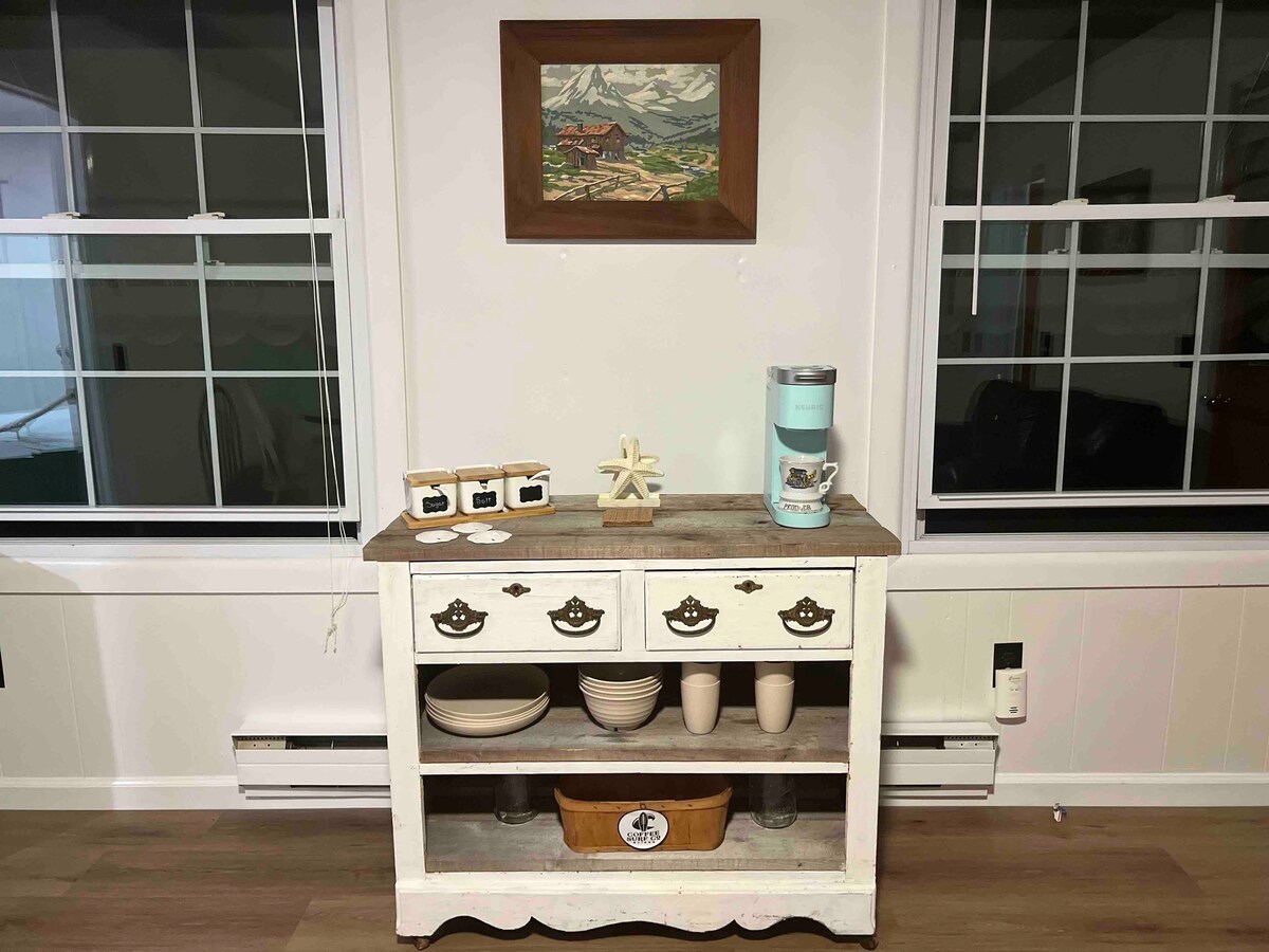 1 bedroom cottage 3 houses from the beach walking distance to restaurants, ice cream, bars, liquor store, mini golf, coffee and shops. 1 Queen bed and 1 full sofa bed. Perfect for a couples getaway or a family with young children. 280 Sq ft. Full kitchen, 2 burner gas range top, microwave, toaster oven, refrigerator, full bath with shower, Keurig coffee maker, dishwasher. Private patio, table with 4 chairs, umbrella, grill and outdoor shower No bedding, blankets or towels provided.