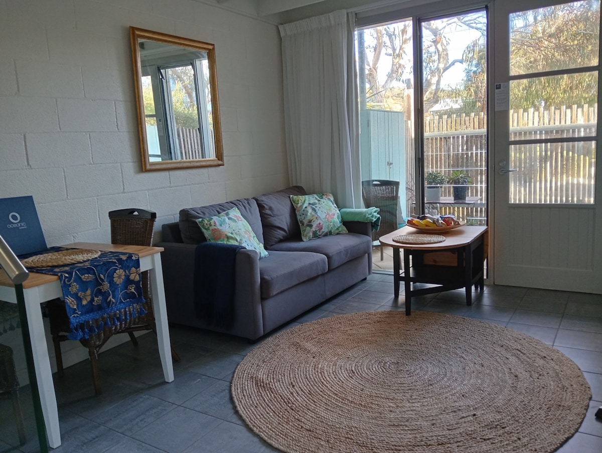 Fabulous location in Jan Juc. Sparkly clean, recently renovated, spacious, light filled self-contained apartment a block away from stunning Jan Juc beach, cafes/restaurants and some of the most spectacular cliffs and rock formations along the walking tracks. The apartment has a kitchenette, new queen size bed, bathroom, split system and smart TV. You may meet Reggie - our beautiful kelpie rescue dog. Perfect for a couple and LGBTIQ+ friendly.