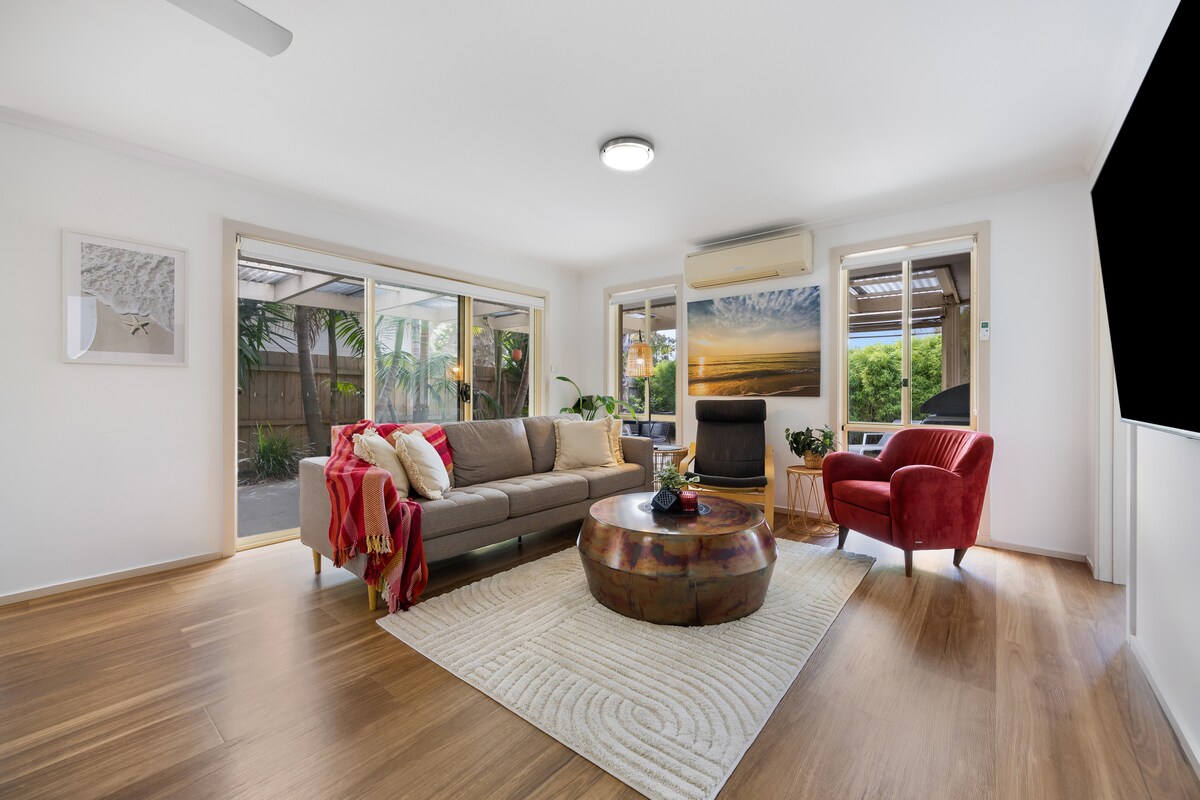Welcome to our lovely, spacious beach house for you to relax and enjoy Ocean Grove and explore the Bellarine. Located in a quiet street, a 15-minute walk (1.2km) to the beach & beachside cafe, hotel, and a few minutes from main shops and amenities. Perfect for 1 or 2 families, there is plenty of indoor and outdoor space. 3 bedrooms + 4th bunk room/movie room, 2 bathrooms, sleeping 8 guests. Relax in the spacious backyard, with large outdoor entertaining area and BBQ.