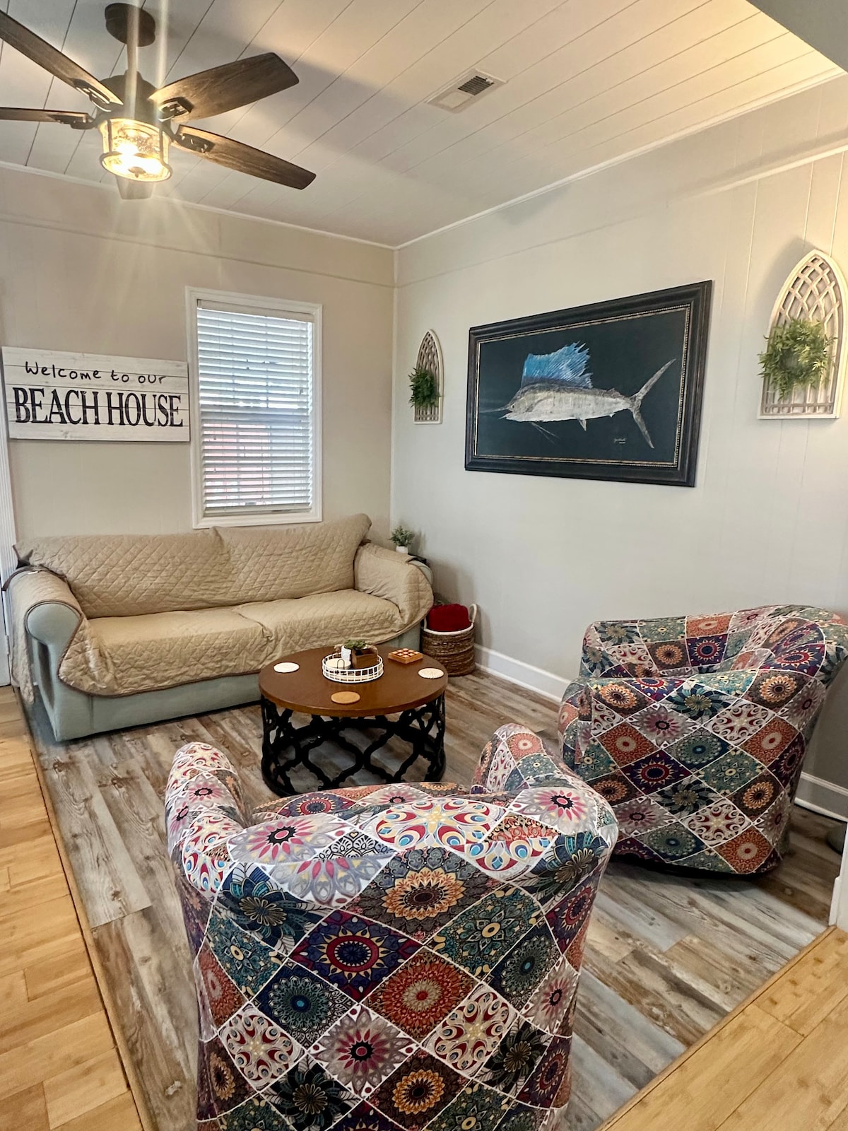 We love our cute beach bungalow! It's in a quiet neighborhood in Surfside Beach just a short block to the beach and ocean. It's only about 15 minutes to Myrtle Beach to the north and Murrell's Inlet to the soutj. The area is known for all-you-can-eat seafood buffets, miniature golf, and regular golf. There are also plenty of restaurants and grocery stores nearby. Our house is pet friendly with a maximum of 3. Keys are in a keybox on front door with code provided about a week before arrival.