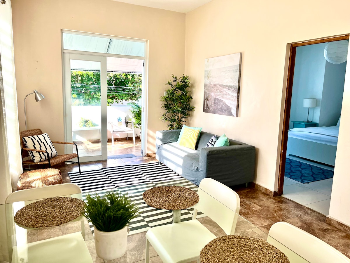 Experience tropical beach vibes in our clean and cozy 2 bedroom boho apartment in Ocean Park. Just one block from the beach, you can start your day with a morning run and stunning Caribbean sea views. Relax on our large leafy terrace, where the ocean breeze will refresh you as you enjoy your morning coffee and plan your adventures. The apartment includes a full kitchen w’ an espresso machine, two bedrooms w’ queen beds, and one bathroom, providing all the comforts you need for a perfect getaway.
