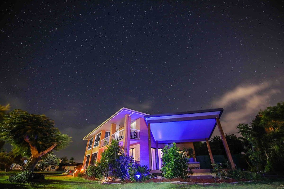 Beautiful Waterfront home. Modern interior. Rare water front, Direct water views, beautiful sunsets. Relax on the pergola with a wine & watch the world go bye. Glass house mountains views. Spacious open plan. Wifi. Fully Ducted air conditioning aircon bedrooms (2 up stairs, 2 on ground floor. All with Water views. 2nd lounge on the ground floor. Plenty of room for a large family. Great location, walking & bike tracks along the water. Secure parking for a boat+ pets. & two drive ways