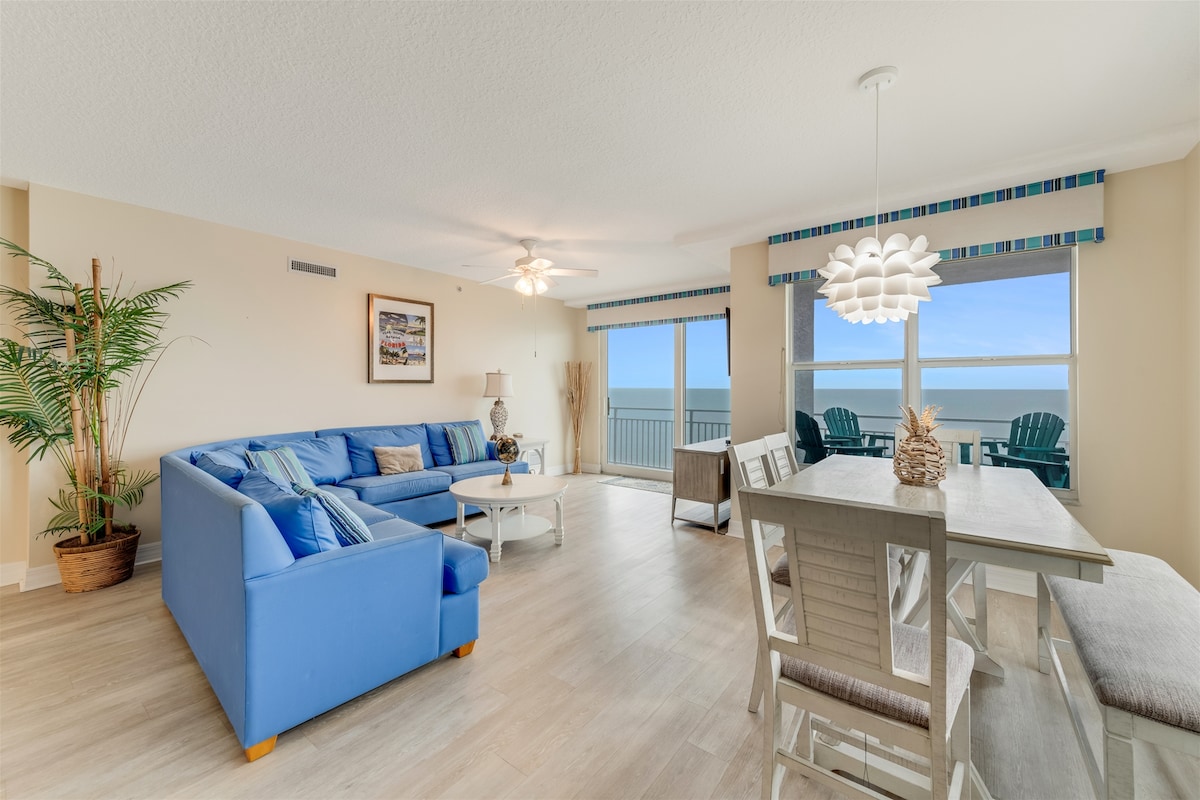 You will love this 10th floor ocean front unit the indoor and outdoors pools, play area kids pool, water slide , 300 -ft lazy river, beachside bar, mini golf, game room . Enjoy this spacious condo with 2 queen beds and a spacious bathroom, full kitchen and a queen sofa bed .Parking free one vehicle in the garage .Extra parking across the street is walking distance for a daily fee, must be 21 years old to book. Also we offer 15% off weekly discount, enjoy all with no resort fees.