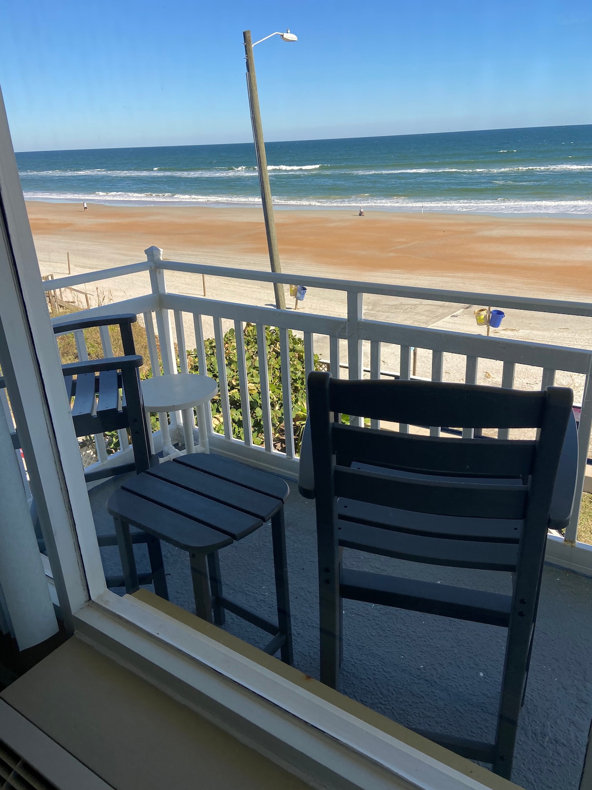 We are located on Daytona Beach a 1 minute walk through the pool area to be on the beach POOL IS OPEN AND INDOOR POOL IS OPEN Kick back and relax in our newly remodeled calm and stylish space. we have a full size refrigerator, you will fall in love with our balcony views. we have all pots and pans and kitchen supplies. all linens and beach towels included. we have 1 king bed and a futon couch big enough for 1 adult or 2 small children.