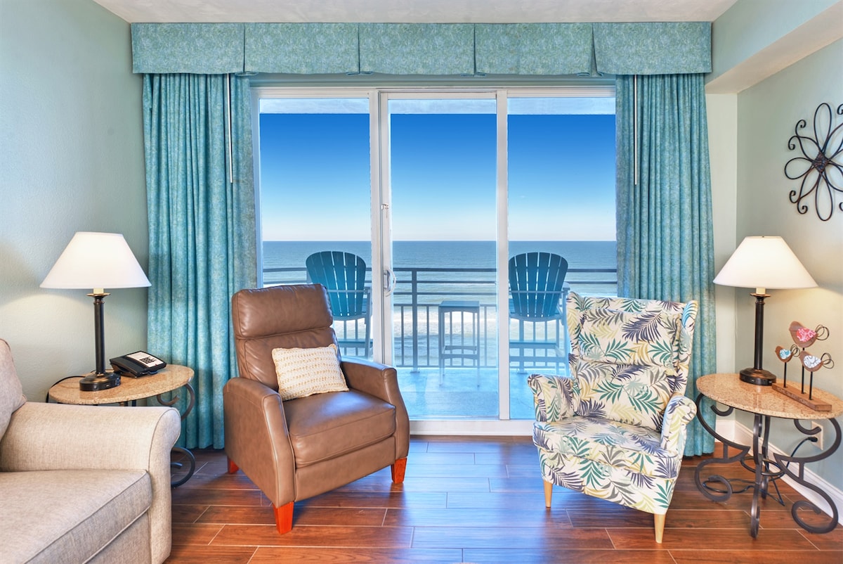 There is nothing more therapeutic than waking up to a beautiful sunrise. Come and enjoy a newly renovated happy place that feels like home. This fully equipped one bedroom condo is a direct oceanfront on the 14th floor overlooking great amenities: multiple swimming pools, a 300-foot long lazy river, waterslide, jacuzzies and a kid's water park. To top it off it is next to the Daytona Beach Bandshell, Ocean Walk Shoppes and movie theater with live concerts and fireworks in the summer months.