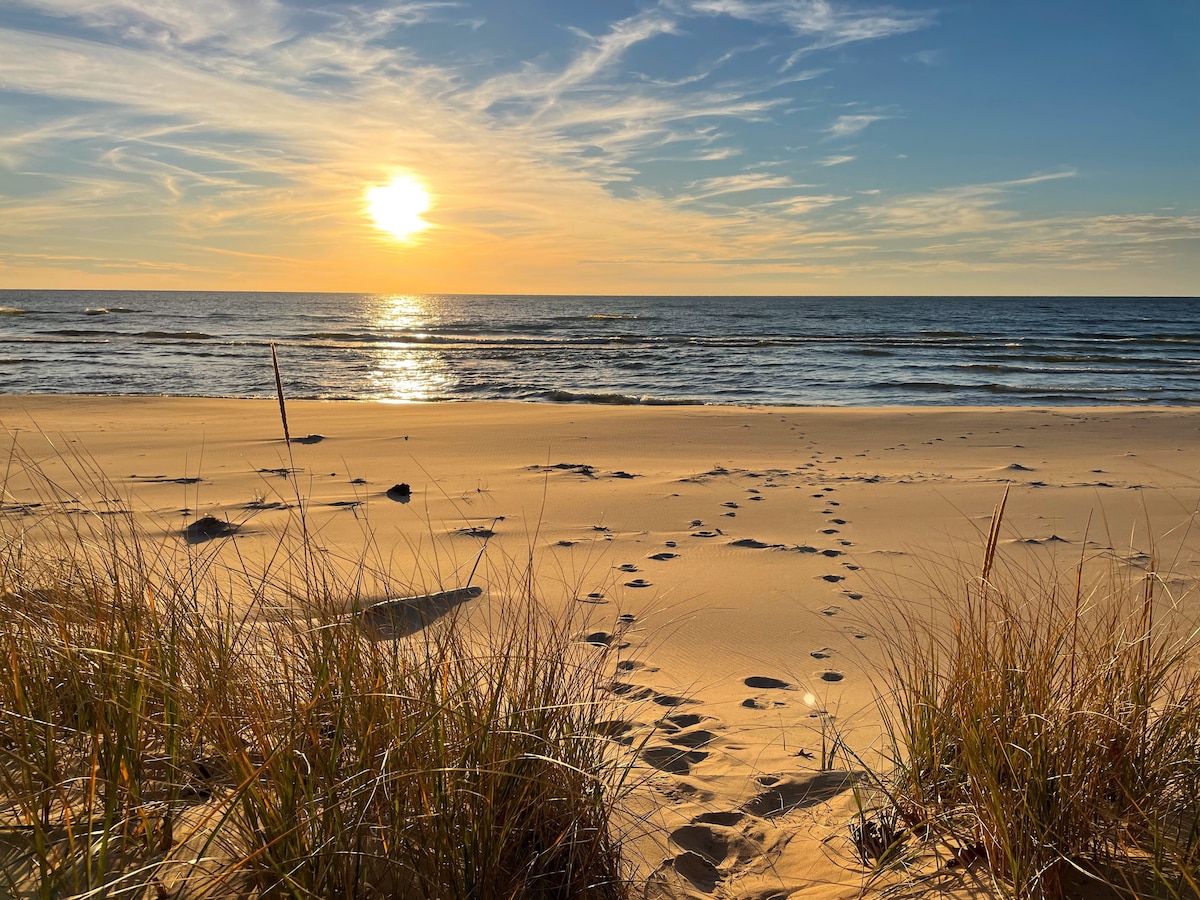 Relax, Unwind, Create Memories! Half mile of private Lake MI beachfront - sugar soft sand, crystal clear water. La Bella Vie Cottage: Clean, comfy, spacious, 2 bedrooms plus, 3rd bedroom/den. Large private yard - grill, picnic table and fire pit. Beach chairs, umbrella, books, toys, games. Enjoy... afternoon swims in crystalline waters, evenings kayaking at sunset, starry moon lit walks on the beach, the beauty of fall, the drama of winter. A multitude of attractions close-by!