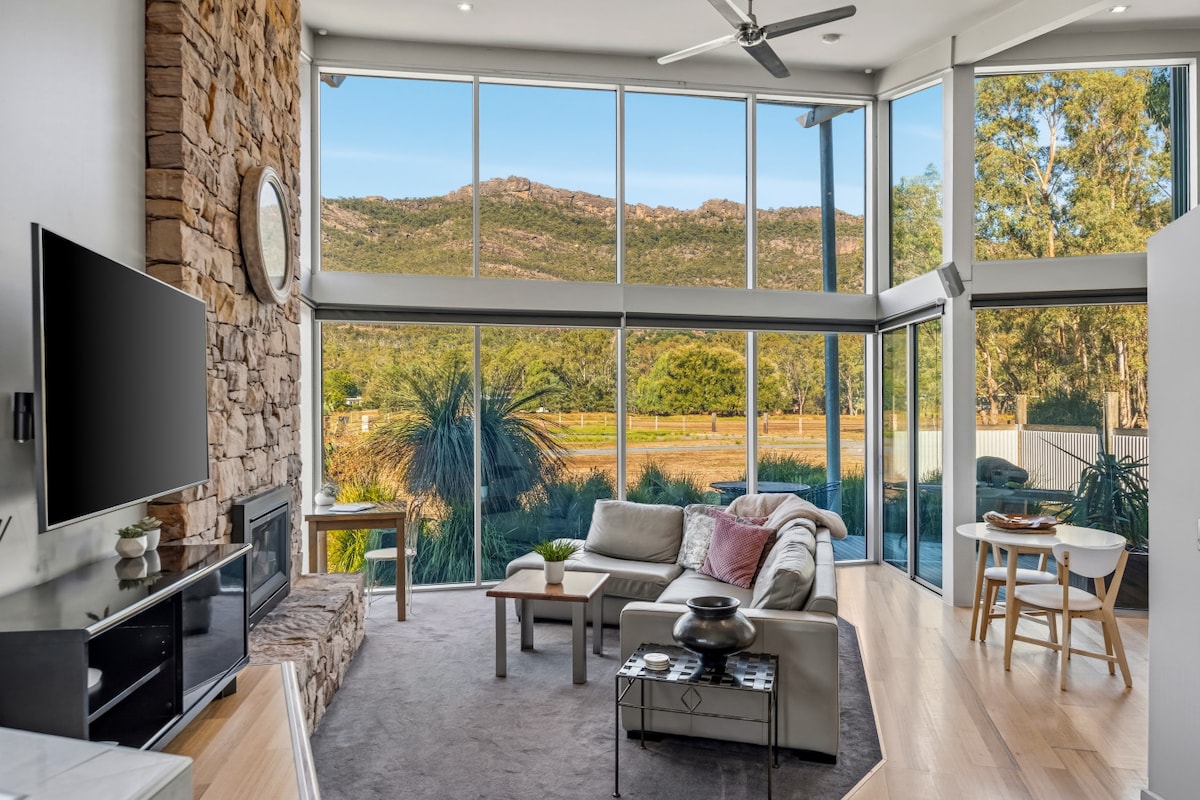Your own luxury villa The perfect place to escape Whether you are relaxing in the large king bed, soaking in the incredibly huge spa or lounging on the beautiful leather couch, you have stunning views, all from inside the luxury of your very own villa. The ultimate romantic setting. Enjoy lazing by the stunning Grampians stone fireplace in complete seclusion, luxury & just minutes walking distance from your villa to the delightful Cafes & Restaurants of Halls Gap.