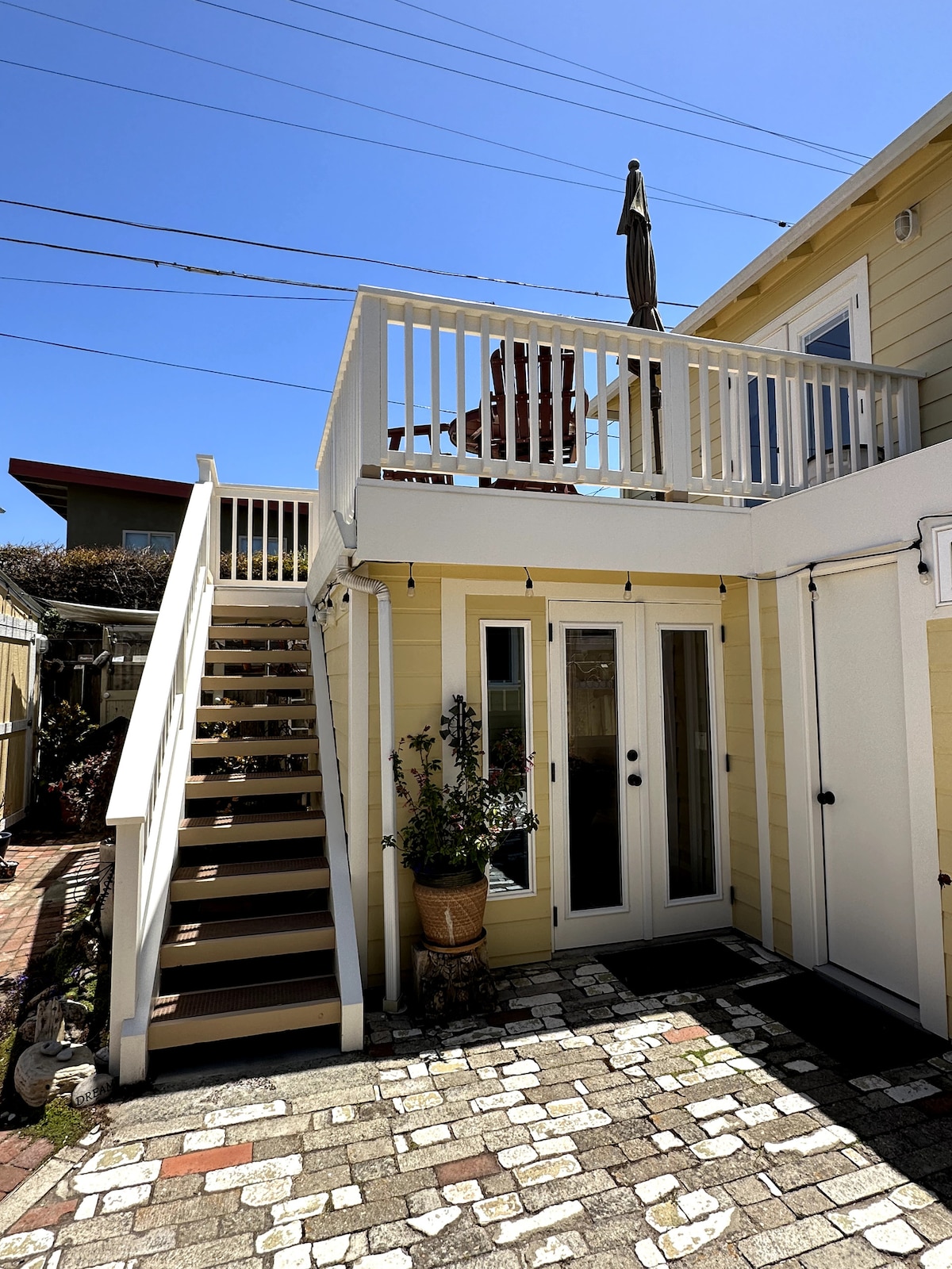 1/2 block from beach, upstairs bungalow, clean, furnished and open floor plan, great room, deck, dining and livingroom, 1 bedroom w/ queen bed/ black out curtains, 50" Flatscreen with good wifi, Roku, large deck for sunning, bird watching. Wildland-urban interface local. We've seen raccoons, a coyote, swallows nest in spring and sometimes spiders make webs outside. We are right where urban and wildland meet. Longer stays available, just ask. Calendar is often blocked, but we can open dates.