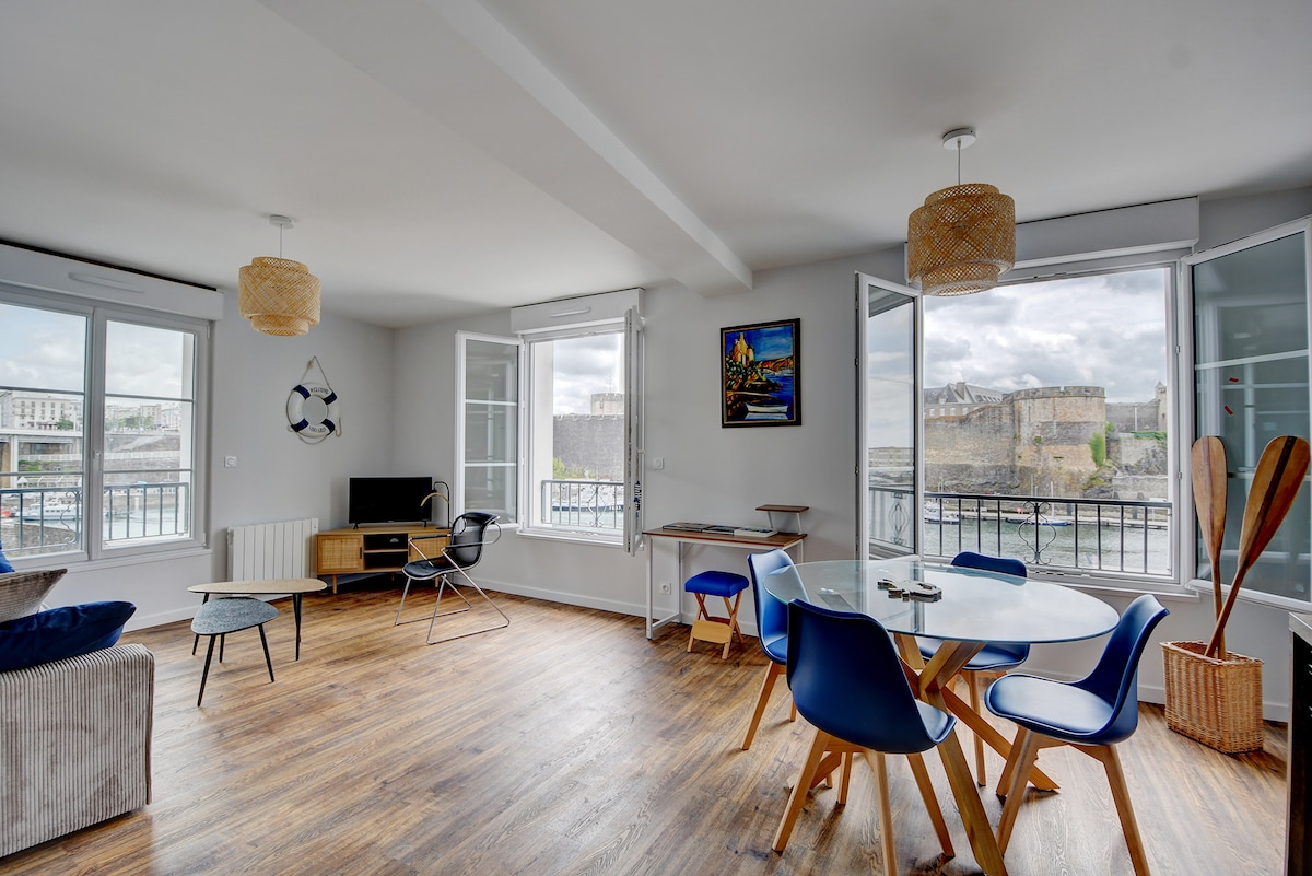 Simplifiez-vous la vie dans ce logement paisible et central. Appartement totalement rénové à deux pas du téléphérique, proche des halles Saint-Louis ( commerces et restaurants), de la rue de Siam, à 15 minutes à pied de la gare. Appartement au 5 eme et dernier étage avec ascenseur, vue imprenable sur la Penfeld, les Capucins, le pont de Recouvrance, la tour Tanguy et la mer. Les chambres sont calmes avec vue sur la cour d’une Ecole,l’église Saint Louis , et petite vue sur la mairie)