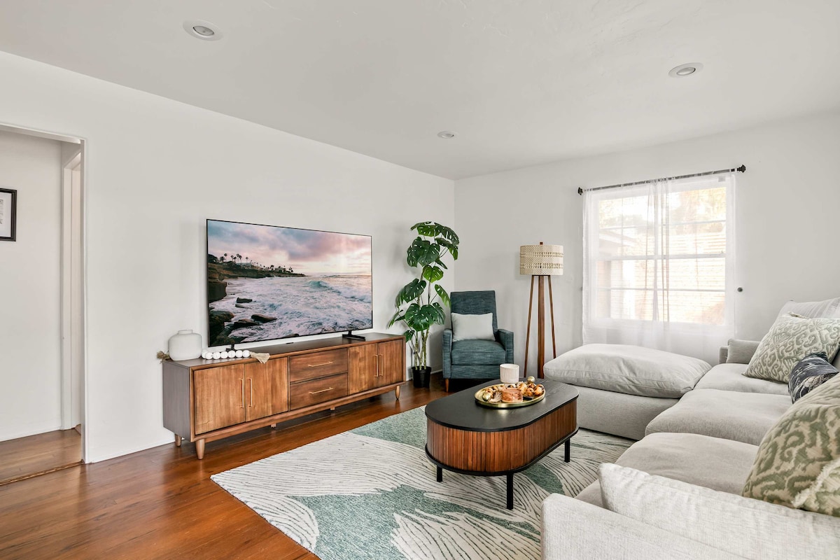 Step into the spacious and fun 3BR 2BA family oasis in the scenic coastal town of Encinitas. It promises a relaxing retreat just a few minutes from pristine beaches, a vibrant downtown area, excellent restaurants, attractions, and natural landmarks. The stylish design and a rich amenity list will leave you mesmerized. ✔ 3 Comfy BRs ✔ Open Design Living ✔ Full Kitchen ✔ Backyard (HD Projector Screen, Fire Pit, BBQ, Dining) ✔ Workspace ✔ Smart TV ✔ Wi-Fi ✔ Laundry ✔ Parking See more below!