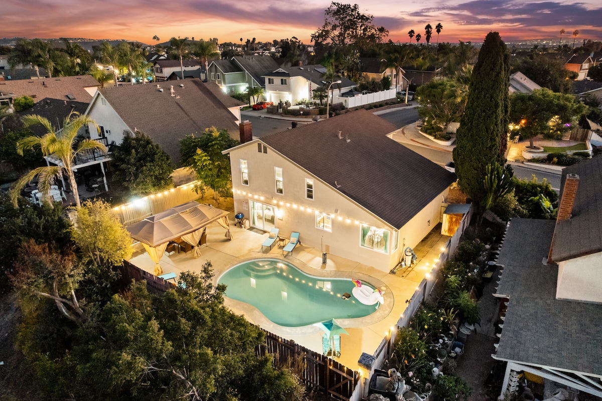 Relax in the sunshine at our "Carlsbad Beach Spa Getaway"! Entire home available with 3 beds in 3 bedrooms plus master retreat with Aerobed. About a mile from the beach, easy freeway access, and near many San Diego attractions. Master Bathroom features 12-Jet Spa built for Two. Other Features include a Pool Table, 60-inch TV, Freestanding Bar, Patio Dining, and Pass-Through Breakfast Bar that connects to the kitchen. Pool and Spa are spacious, heated year-round and located only 2 blocks away.