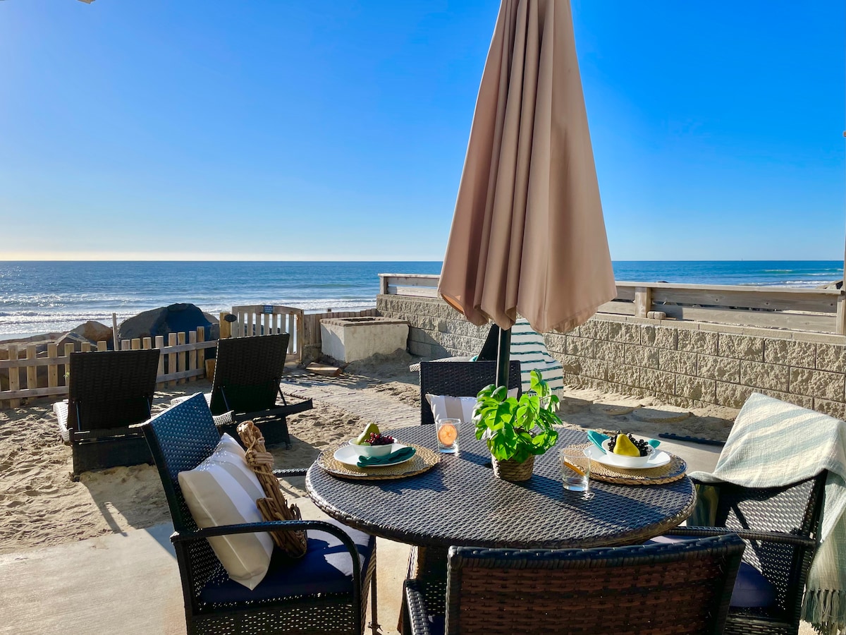 Relax at our beautiful luxury beachfront villa complete with high end kitchen appliances, top quality fixtures, air conditioning, modern furniture and coastal decor. Enjoy watching the waves from your own private front patio, living room, kitchen and master bedroom. Warm up next to our gorgeous gas fire pit and watch the sun go down over the waves.