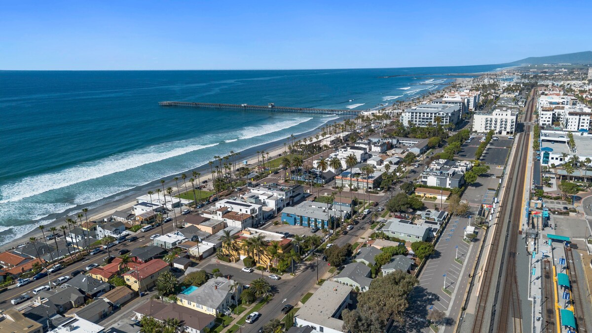 Old beach bungalow built in 1940 with cool vibes On the beach 1 master bedroom with a queen bed and another bedroom with a full bed 5 minute walk to O'side's downtown stores, restaurants, movies, bars.... Train station 4 blocks away (to downtown San Diego, Los Angeles, Disneyland) Close to the pier, fishing, marina, kayaking, sport fishing Short ride to Carlsbad Village Guests have access to the surfboards, boogie boards, and beach chairs at the house. Coin-operated washer and dryer are shared with other units. The Strand is an Oceanside attraction with parks, beach access, bonfires, swing sets, and food stands. Downtown Oceanside is less than a mile away from the house and is surrounded by great restaurants and events. Every Thursday there is a farmer's market and night market with food and live music downtown. Oceanside is close to lots... ~35 min drive to San Diego, The Zoo, Sea World, Mission Bay, Balboa Park, UCSD, San Diego Airport ~50 min drive to the international border ~50 min drive to Disneyland ~90 min drive to Los Angeles and Hollywood The bungalow is located within walking distance from the Oceanside train station. Parking is available on Pacific St. Access to the house on Pacific St. is through a green wooden gate (pictured). The Bungalow is on the 2nd floor and is not wheelchair accessible