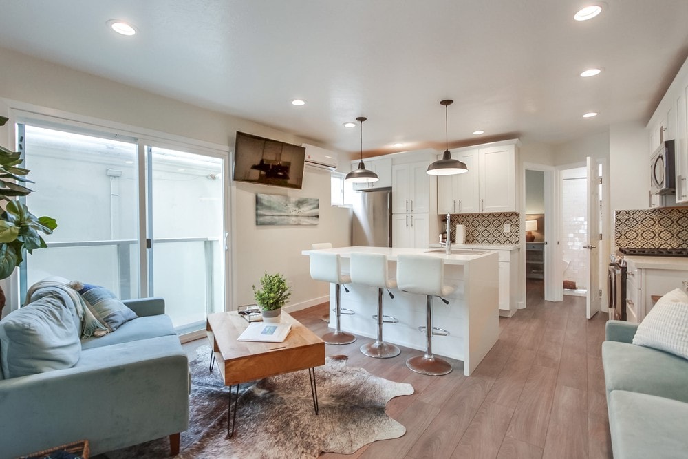 Our Studio unit offers the best of beach life on the California coast. Close to the sand, the city center, pier and famous attractions like Disneyland, SeaWorld and Legoland, you’ll love this place for its proximity to the ocean, coziness and atmosphere! This suite includes a queen bed, dinette, a bathroom with a walk-in shower, and a kitchenette. You can watch the waves, the sunsets, or the surfers right outside your front door.