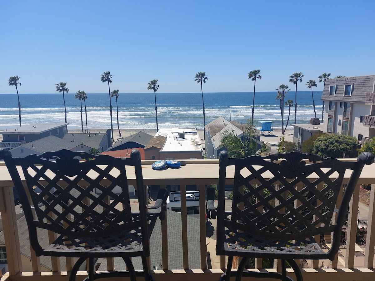 Our upscale unit is a 3rd floor 'penthouse' in the "A" building on the south side of North Coast Village. It has a fantastic view of the surf, sand and the Oceanside Pier from your large dedicated rooftop balcony! There's a beautiful, fully upgraded kitchen, a king in the master and a queen sleeper sofa in the LR. Upstairs is a large & open loft bedroom with a queen Murphy bed, a breakfast nook and a 75” TV. And did we mention your new happy place, that fabulous rooftop deck?