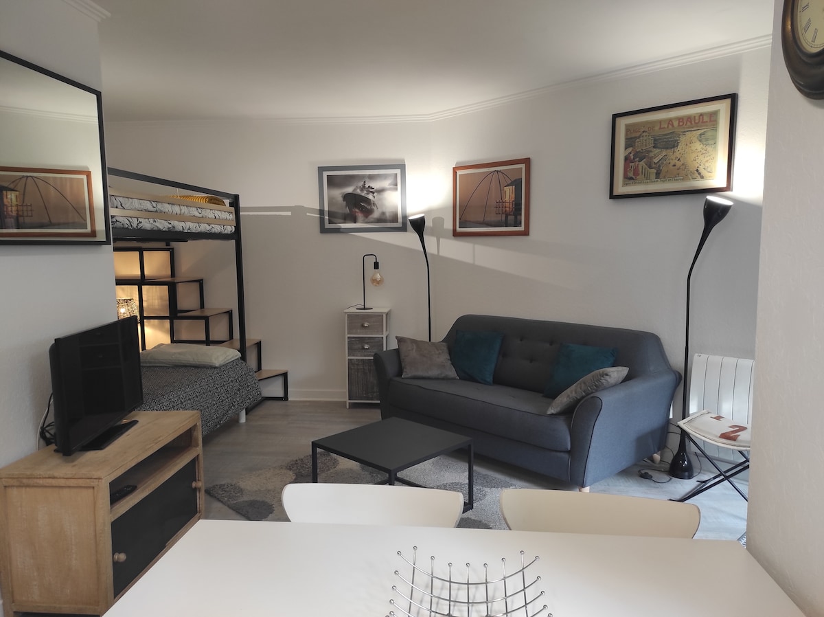 Venez profiter du Croisic dans ce grand studio au premier étage d'une petite résidence de six appartements Vous pouvez tout faire à pied restaurant, bar cinéma ,boulangerie ,commerces ,port L'appartement vient d'être entièrement rénové . Il y a tout les ustensiles de cuisine et le linge de maison est fourni. Pour le stationnement il y a souvent de la place à proximité sinon il y a un très grand parking gratuit à 300 mètres La gare TGV est à 1km