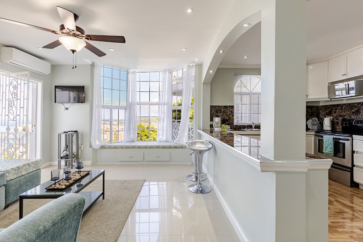 Newly renovated 1 bedroom apartment, designed for a modern lifestyle, Platinum Apt @Sky Castles features an open layout with a calm and inviting decor for the discerning traveler, with high end finishes and all the comforts of home. The apartment boasts contemporary kitchen appliances, SMART TVs and a private porch with a spectacular panoramic view of Ocho Rios, the beach and the Caribbean Sea. The property is near all major attractions and a few minutes walk to beaches, restaurants and stores.