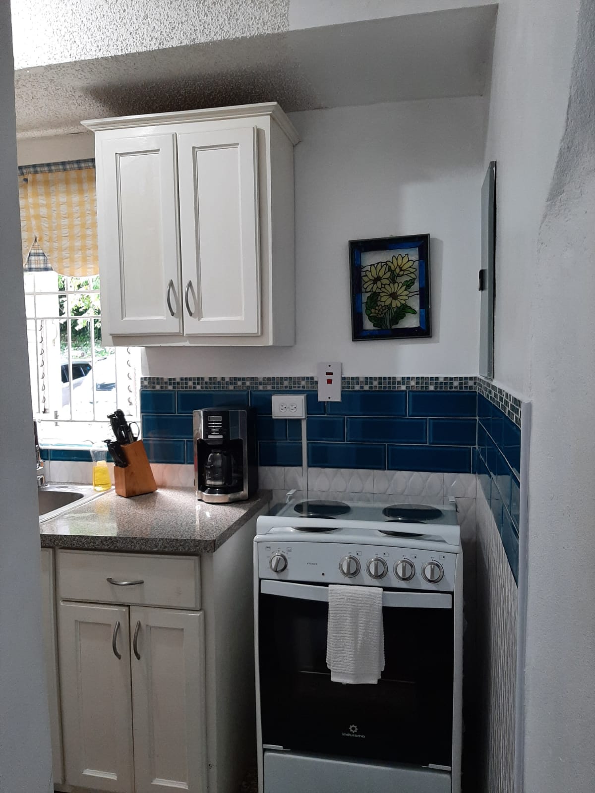 Post Melissa-All utilities are working. Modern poolside studio,city+ocean views. Alexa Smart & keyless entry. Central in Ocho Rios, gated 24-hr security, Sky Castles, 5 min drive to attractions (Dunn’s River Falls, Mystic Mountain) & stores. Porcelain tiles for a luxurious feel. Equip kitchen, smart TV, Safe, shower, 1 queen bed for 2 & a sofa bed for 1. Covered patio, free parking & access to 2 pools make this a must stay. A camera is above the front door, this is for guest safety and security.