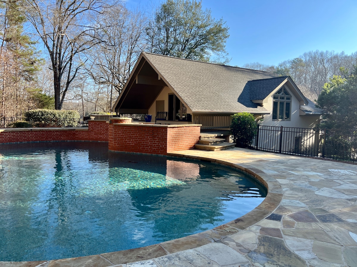Unwind in this midcentury modern pool house in Five Points in Athens, GA. You'll have the pool to yourself, all 55,000 gallons of it plus a hot tub, steps away from a comfy king-sized bed. This is a brand new building with a kitchenette, grill, outdoor shower, a screened porch, and is solar powered. Tesla charger available. You'll see deer every morning and evening and maybe a famous football coach who lives nearby.