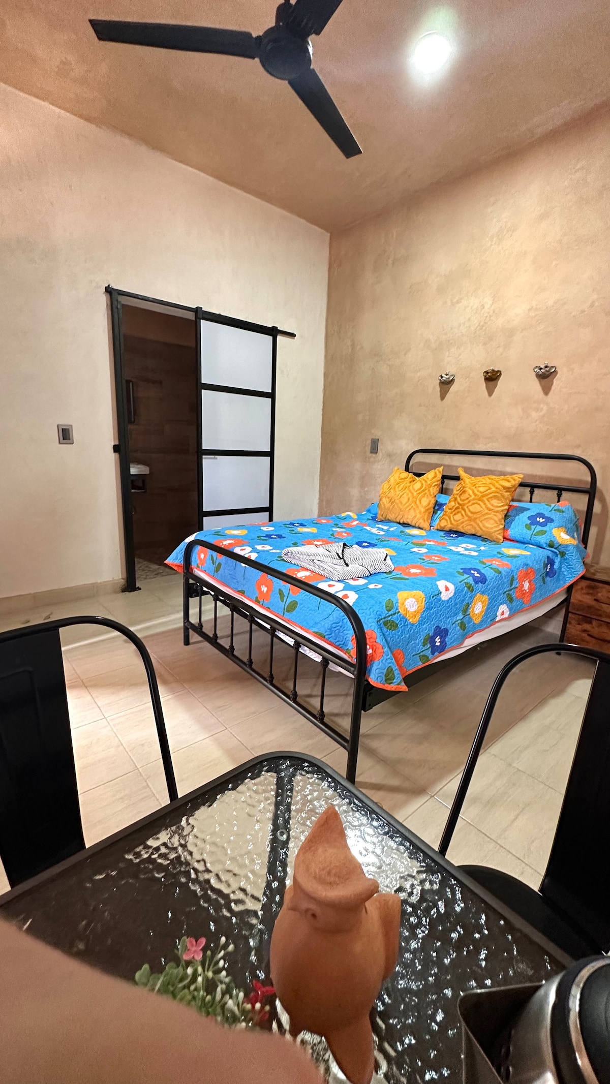 La casa es un loft contemporáneo, verás mobiliario hecho a la medida del espacio, decoración regional y acabados rescatados de la construcción original como lo es la piedra de los muros de bajareque que colocamos arriba de la cocineta o la tarja que data de los años 50's. La habitación en planta alta responde a las necesidades de almas viajeras. Cuenta con una cama Queen size y debajo de ella corre una base de un colchón de la mejor calidad para tu descanso.