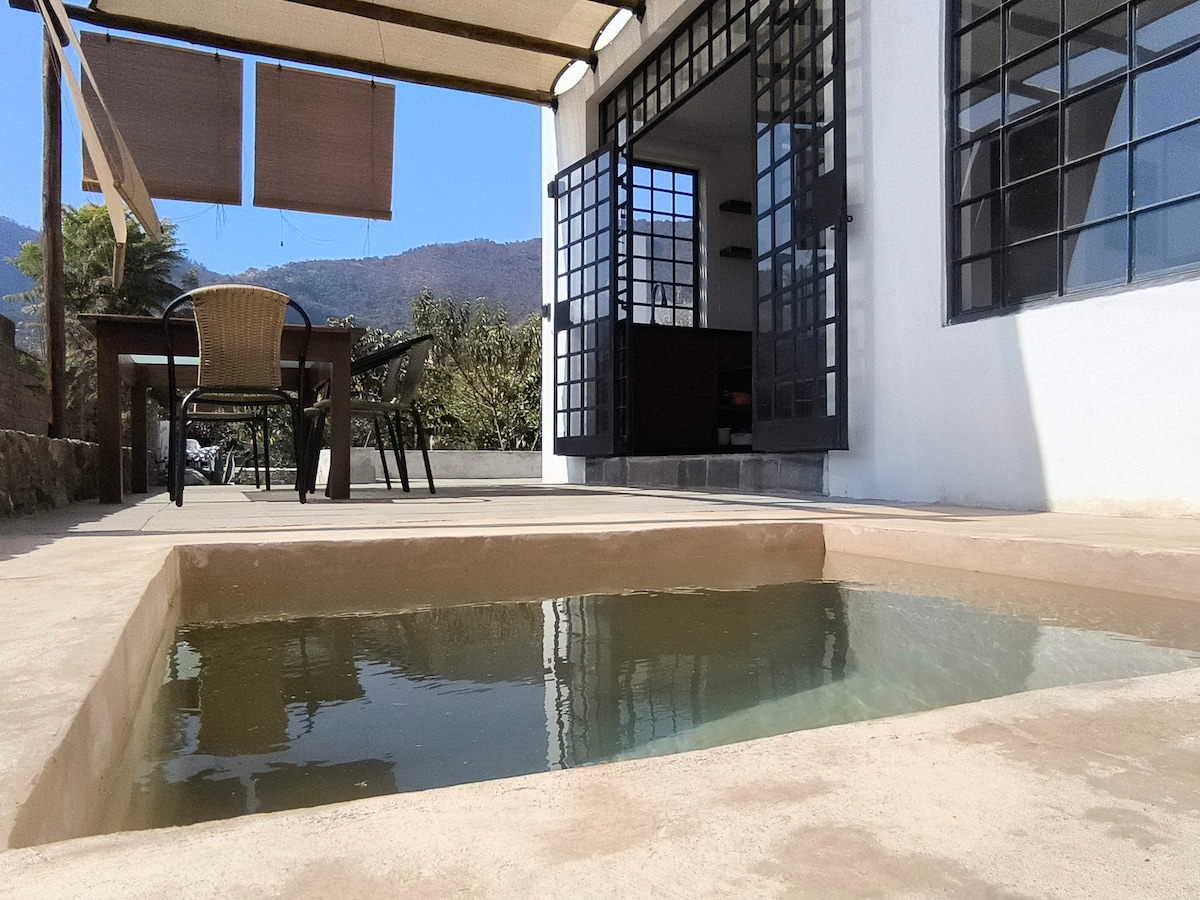 It has a garden and natural swimming pool, exclusive for you. Decorated and furnished to detail. With two sleeping areas, one in a small loft and the other on the bottom part, both queen size beds, quality linens and hypoallergenic pillows. Among the hills of the mythical Malinalco, we are located in a rural community, you´ll be able to experience it´s daily life, activities and the sounds of the country side will make you forget about the city rush. Perfect for artists, meditators and couples.