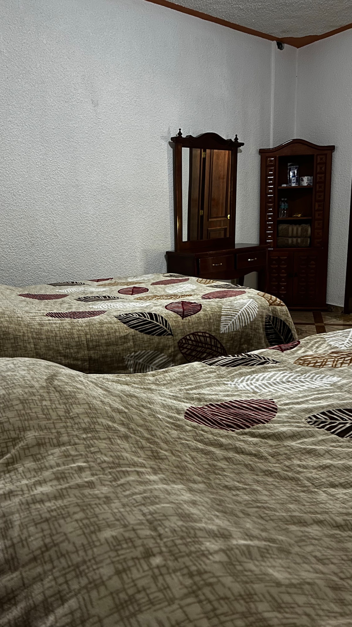 Acogedora habitación en planta baja con 2 camas individuales, totalmente accesible y apta para silla de ruedas. La renta incluye uso completo de la casa: alberca climatizada, autobar, cocina equipada, mirador y salas de estar. Desayuno incluido; cocinera opcional $550/día. Check-in 15:00, check-out 12:00. No fiestas, acceso a la alberca solo para huéspedes, estacionamiento 3 autos, no es pet friendly, niños bajo supervisión. Los huéspedes son responsables de cualquier daño o desperfecto.