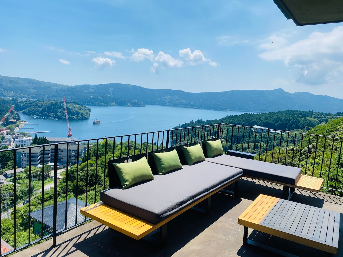 "Noël Hakone Skylight"坐落于风景如画的箱根群山之中,其独特魅力在于通过精心设计的天窗欣赏芦之湖的壮丽全景,以及占地4000平方米的广阔庄园。这座超过200平方米的精致建筑,是业主被这片美景深深吸引后,历时一年精心策划与全面翻新的心血结晶。 宽敞豪华的200平方米木甲板可饱览箱根四季变换的绝美景色,配备高品质烧烤设施,让您在清新的山间空气中与亲友共享美食时光。户外设有具有北欧风情的原木桶状桑拿,让您彻底温暖身体后,可以在星光闪烁的夜空下泡在按摩浴缸中释放身心的疲惫。室内则有十和田石精心打造的典雅浴池和品质上乘的半天然温泉,为您带来宁静而奢华的休憩体验。 白天,您会被周围自然环境的翠绿山林和湖水的深邃蓝色所深深吸引;入夜后,满天繁星与静谧水面的绚丽倒影交相辉映,创造出如诗如画、如梦似幻的景象,仿佛时间在此刻完全静止,让人陶醉其中。 别墅内配备现代化齐全的家电和高品质日用品,完美融合了现代都市的便利与深山的宁静祥和。在这片被丰富多彩自然环境环抱的私密空间中,尽情享受远离日常喧嚣、回归本真的箱根时光。