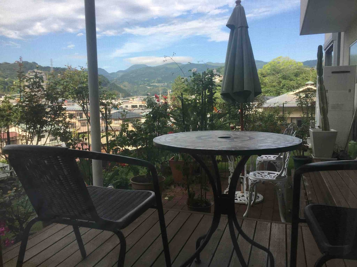 A complimentary organic breakfast and drink bar: -Homemade Sourdough bread, granola, milk, frozen fruits, peanut butter and jam) ,Organic tea & coffee. We offer an entire 2nd floor with shared main entrance and stairs on three-story house. The owner lives on the 3rd floor with her dog. The entire 2nd floor is all yours. A full kitchen, living room, dining room, bathroom,Japanese style tatami room (2 futon sets), bedroom (two single beds), spacious balcony with fantastic mountain view!