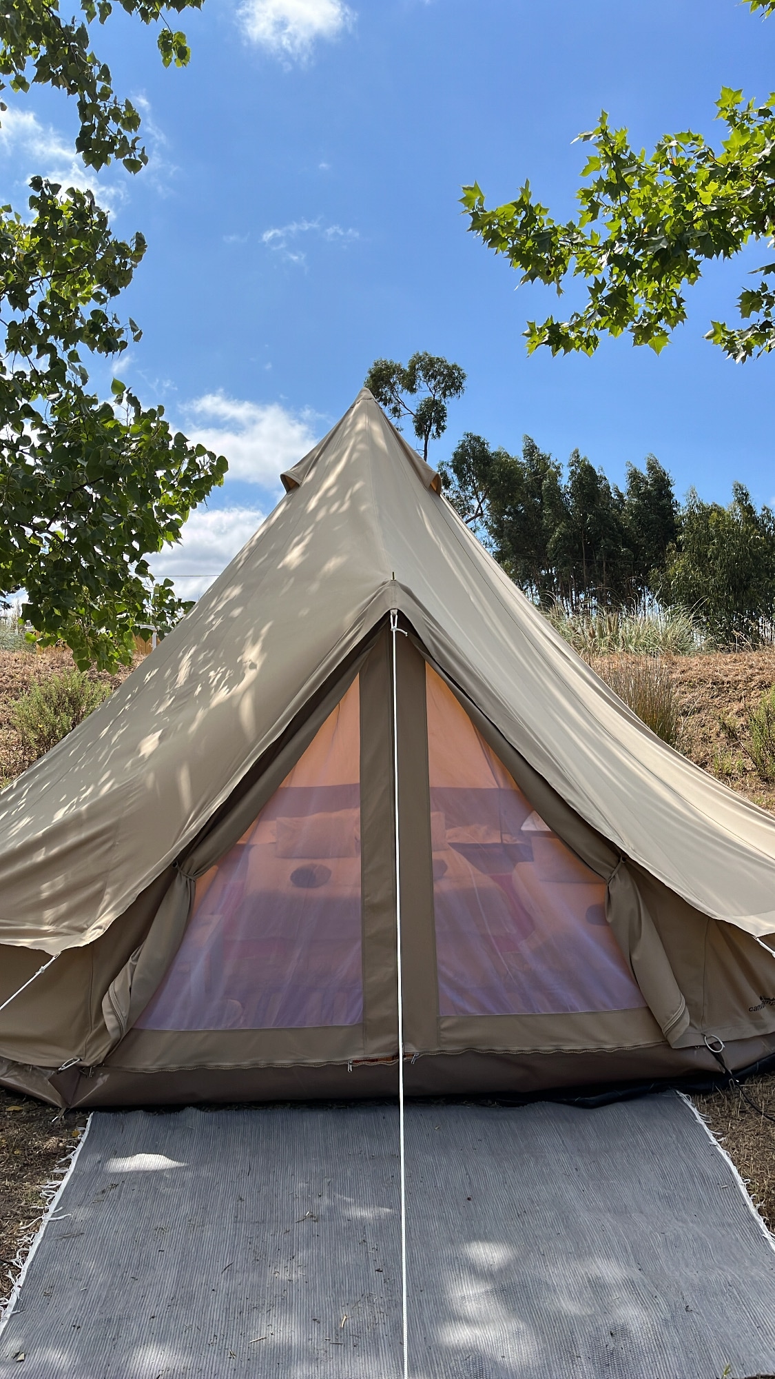 Tenda de Glamping no meio da natureza, equipada com 2, 3 ou 4 colchões no chão, roupa de cama, eletricidade e cadeiras para relaxar no exterior. A casa de banho partilhada encontra-se a cerca de 30 metros da tenda. A 100 metros irá encontrar a cozinha partilhada equipada com panelas, loiça, talheres, torradeira e um pequeno espaço no frigorífico partilhado para manter os seus ingredientes frescos. A 150 metros encontra-se a piscina partilhada que poderá usufruir durante a sua estadia.