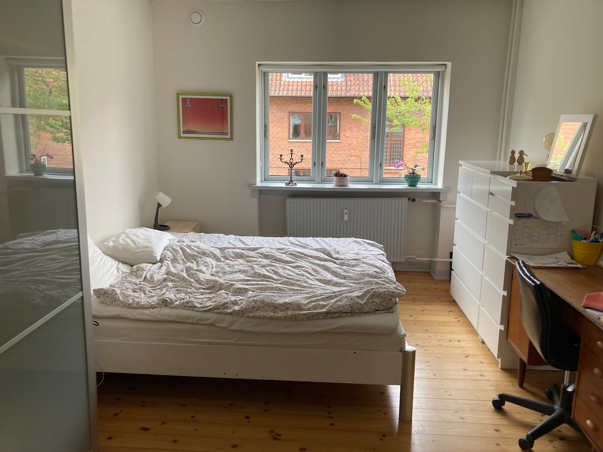 Bo centralt i en hyggelig lejlighed med charmerende detaljer. Highlights: ✨ Gåafstand til gågaden, banegården, letbanen og indkøbsmuligheder 🧘♀️ Roligt kvarter 🚘 Gratis parkering lige ved boligen 🌱 Gårdhave Hvis I ikke spiser i byen, så rummer lejligheden et stort køkken med plads til madlavning. Kogebøgerne står allerede fremme - både til veganske- og kødretter. Du er på ferie - så der er naturligvis også opvaskemaskine 🧼 Lejligheden vil indeholde andre møbler fra januar 2026 ☝️