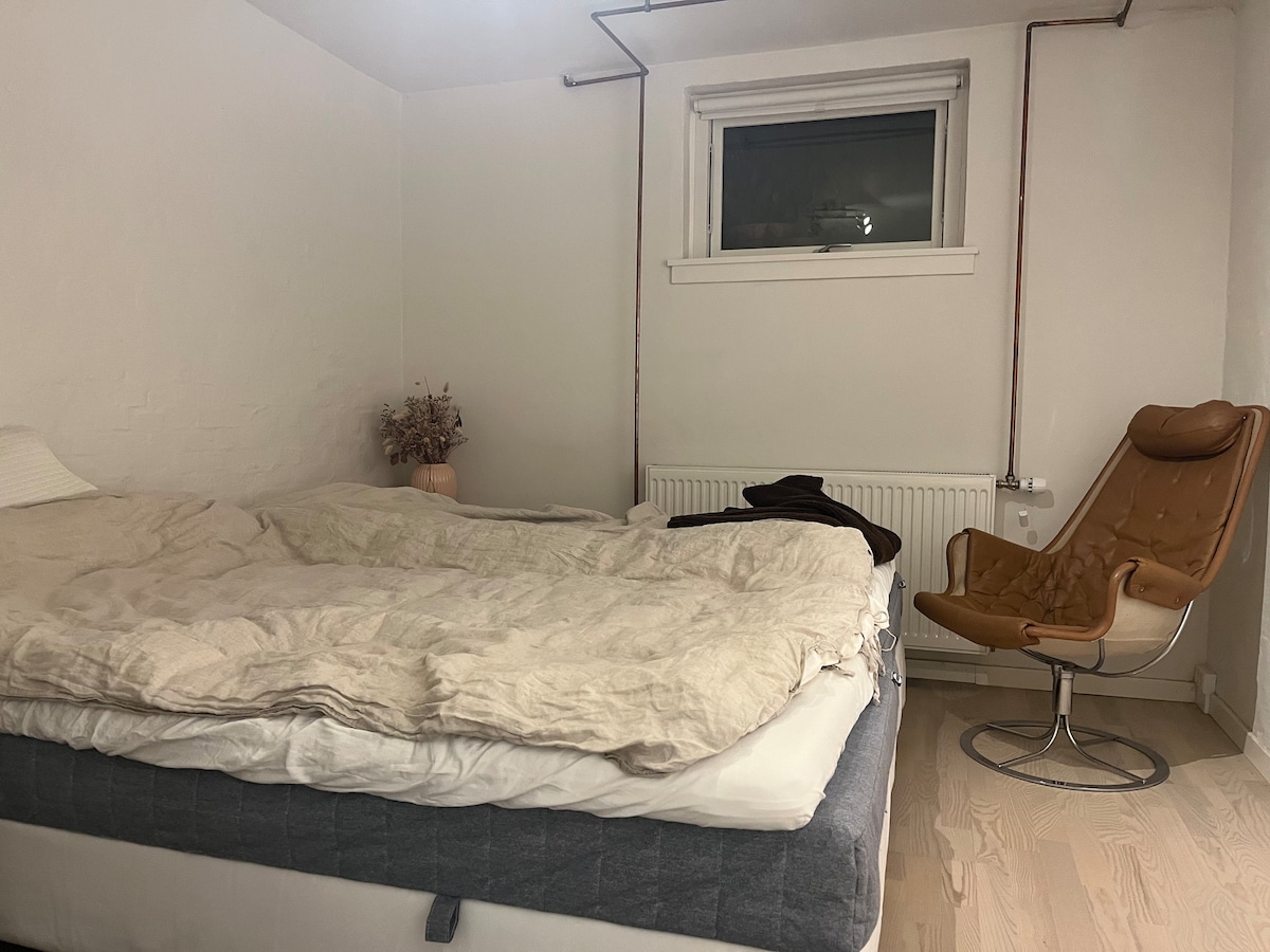 Hyggelig kælderlejlighed i byhus midt i Odense. Her er du bare 15 minutters gåtur fra alt, som centrum af Odense har at byde på. (H. C. Andersens Hus, Odeon, Brandts Museum, Banegården). I lejligheden har du egen indgang, eget bad samt et lille tekøkken med mikrobølgovn, elkedel, køleskab og fryser. Soveværelset er udstyret med en stor dobbeltseng. Det tilstødende rum kan rumme op til to ekstra personer på luftmadras. Ønskes dette vil der blive pålagt et mindre gebyr per nat for den service.