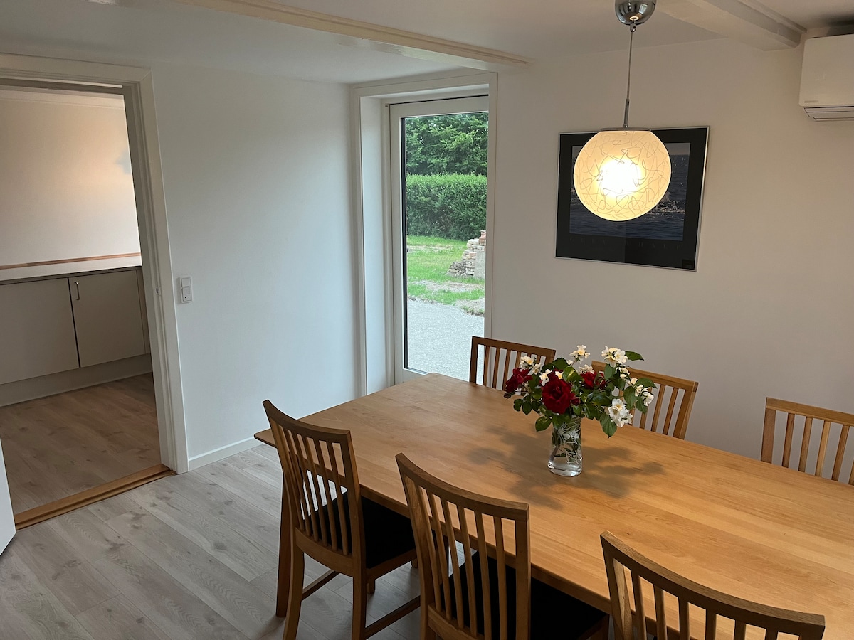 Minimum 2 overnatninger - minimum 2 nights. Super beliggenhed i kort afstand til centrum, med spisesteder, cafeer og museer. Parkering lige ved døren samt supermarked, bager og tank-station. Der er egen terrasse med havemøbler - både overdækket og til sol, grill og bålsted. Alt er ny renoveret. Bemærk: Linnedpakker kr. 50,-/pr.person (bestående af sengelinned, 4 håndklæder, bademåtte, viskestykker mv.) obligatorisk. Boligen er ikke egnet til børn eller gangbesværede personer.