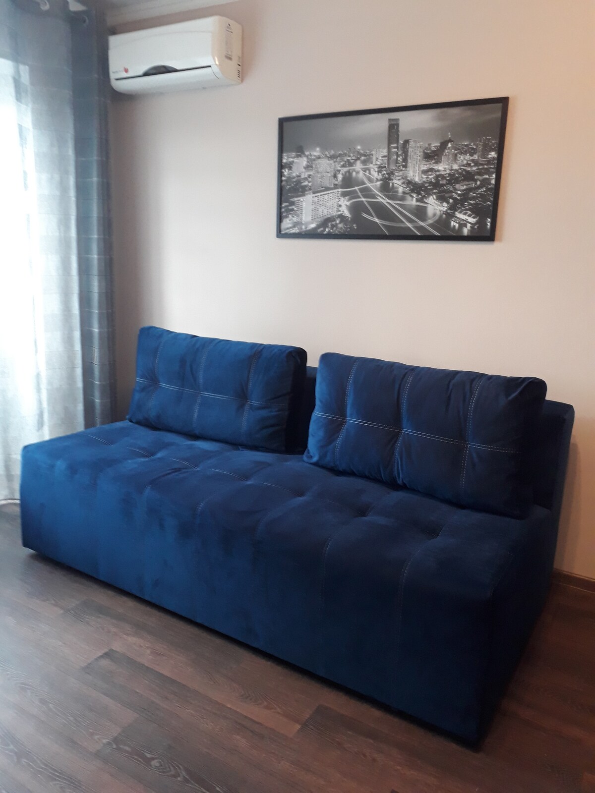The apartment is a cozy two-room, one-bedroom space (50 sq.m), located in the very heart of Odessa. Access to the apartment is through a charming Odesa courtyard, with a secured front door, followed by a long hallway that leads to the second-floor apartment entrance. The bedroom, measuring 15 sq.m, is furnished with a comfortable queen-size bed and nice walk-in closet. A fold-out couch can be used for an extra guest. The apartment is equipped with everything necessary for a comfortable stay.