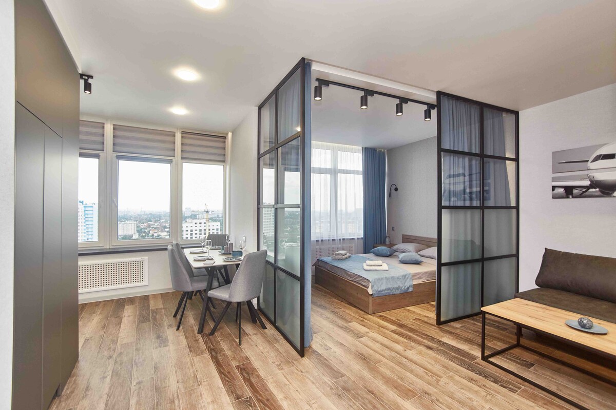 Наша квартира сочетает в себе удобное расположение у моря и стильный современный интерьер, что делает её идеальным выбором для комфортного отдыха или деловых поездок. Просторная комната, оборудованная кухня и уютный балкон создают атмосферу уюта и релаксации. Безопасность обеспечивается охраняемой территорией, а рядом находятся Магазины, Кафе, Развлекательные зоны, Аквапарк, Дискоклубы, городские пляжи. Это идеальное место для тех, кто хочет насладиться Одессой и ярко провести время.