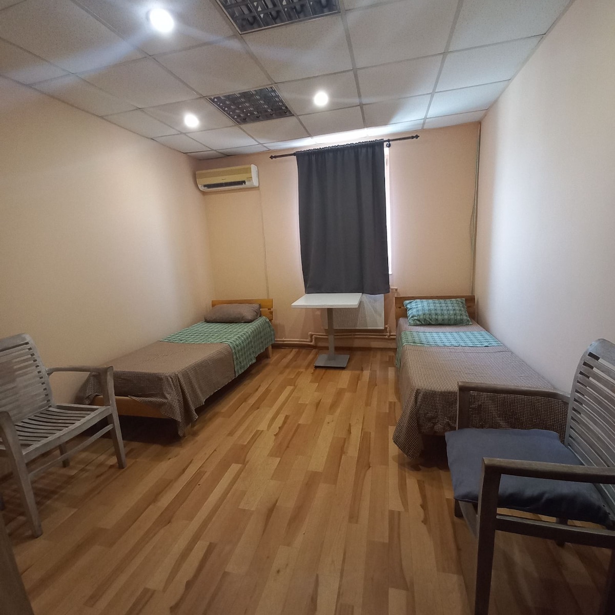 Номер 2-х местный. Условия проживания: В номере две одноместные кровати, оснащенные ортопедическими матрасами, постельные принадлежности. Шкаф, стол, стулья. Кондиционирование номера. Бесплатный интернет. Просторная кухня, столовая, где можно приготовить обед (кухня оснащена всем необходимым). Общий с/у с душевой кабиной. Помещение для стирки, бытовая техника. Парковка на территории хостела.