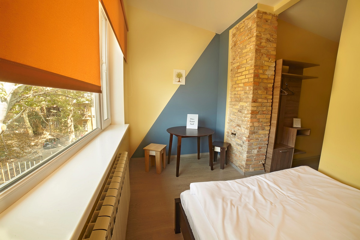 The double room is located in Le Rêve city hostel in the very center of Odessa. The room has a double bed, bedside tables, a hanger, a table on wheels, a TV