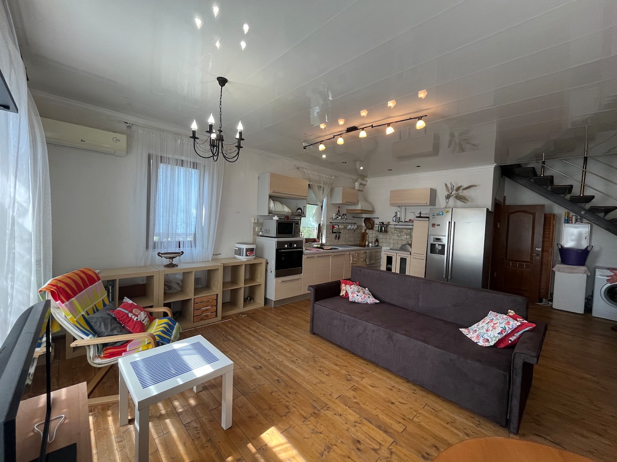 Welcome to a cozy 2-story house in Arcadia. Closed, territory with a garden (shared with the owners' house, see photo). Just 3-5 minutes walk - and you are at the sea. Nearby there is a shelter in the complex Kadorr - 150 m. 1st floor - full kitchen, bathroom, 2nd floor - spacious large sunny room (no doors), shower, place to work. Fast wi-fi, parking. Ideal for couples, solo travelers, couples with kid, those who appreciate the atmosphere of comfort, silence, greenery and walks to the sea.