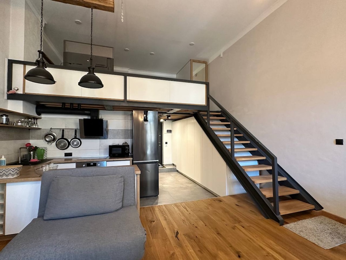 Ця квартира в центрі міста, поруч із відомою Книжкою, зроблена у сучасному скандинавському лофт-дизайні. На першому рівні вітальня з повністю забезпеченою кухнею та обідньою зоною. На другому рівні затишна спальня, що забезпечує комфорт і приватність. Квартира оснащена всією необхідною технікою для вашої зручності. Особливий шарм додає балкон, де можна насолоджуватися кавою або читанням книг. Ідеальне місце для тих, хто цінує комфорт і стиль в самому серці міста. В помешканні завжди є світло.