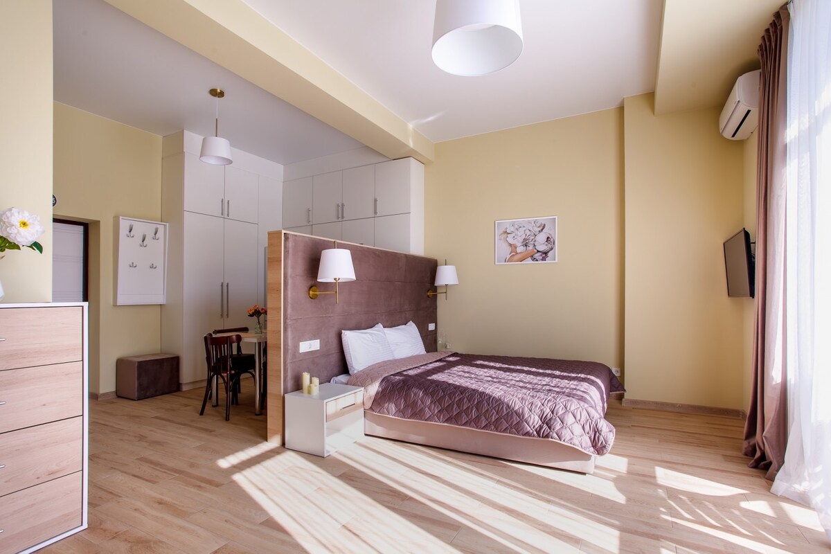 Shato Luxe Boutique Hotel enjoys an excellent location in the city center, 220 meters from the Odessa Opera and Ballet Theater, a 5-minute walk to the Potemkin Stairs, and Deribasovskaya, popular with tourists. The uniqueness of the hotel in its special location. Surrounded by the best restaurants, theaters, museums, entertainment and recreation centers of the city's guests and locals, the Shato Luxe has the advantages of a quiet country house.The comfortable junior suite is decorated in a refined, modern style? furnished with designer interior items.